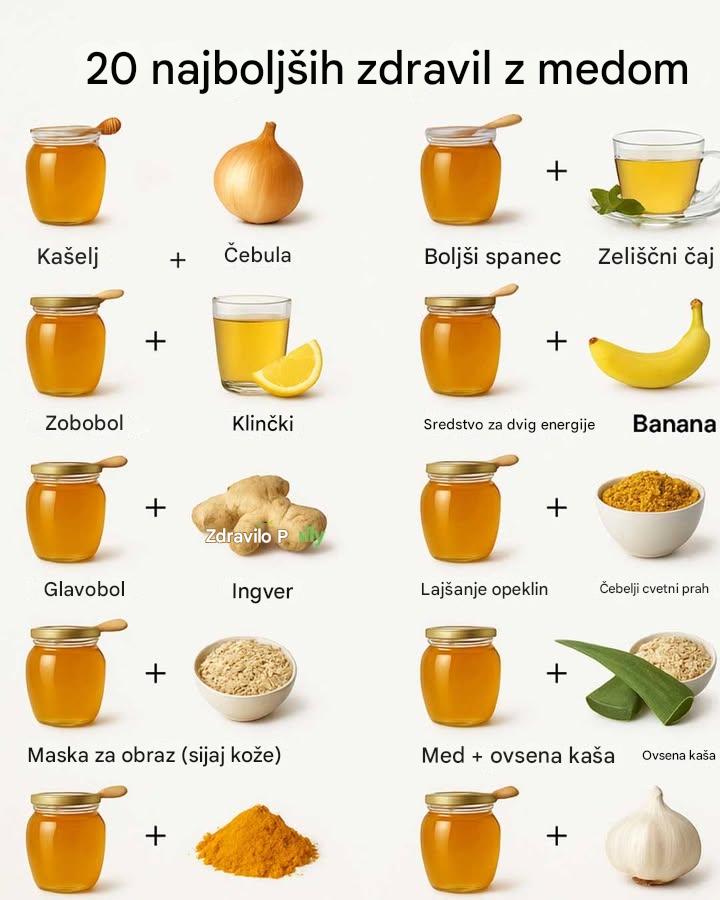 Med ni le okusno naravno sladilo, ampak ga že tisočletja cenijo tudi zaradi njegovih izjemnih zdravilnih lastnosti. Zaradi bogate sestave antioksidantov, encimov in mineralov deluje antibakterijsko, protivnetno in pomirjevalno. Prav zaradi tega je nepogrešljiv sestavni del številnih domačih zdravil, ki jih lahko preprosto pripravite sami. V nadaljevanju razkrivamo 20 preverjenih kombinacij z medom, ki vam lahko pomagajo pri različnih težavah.