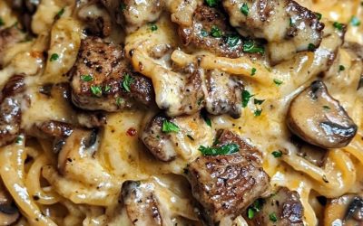 Kremni grižljaji zrezka s česnom in špageti z gobami Alfredo 🍝🥩🧄✨ Ta jed je bogata, drzna in brez opravičila razvajajoča…