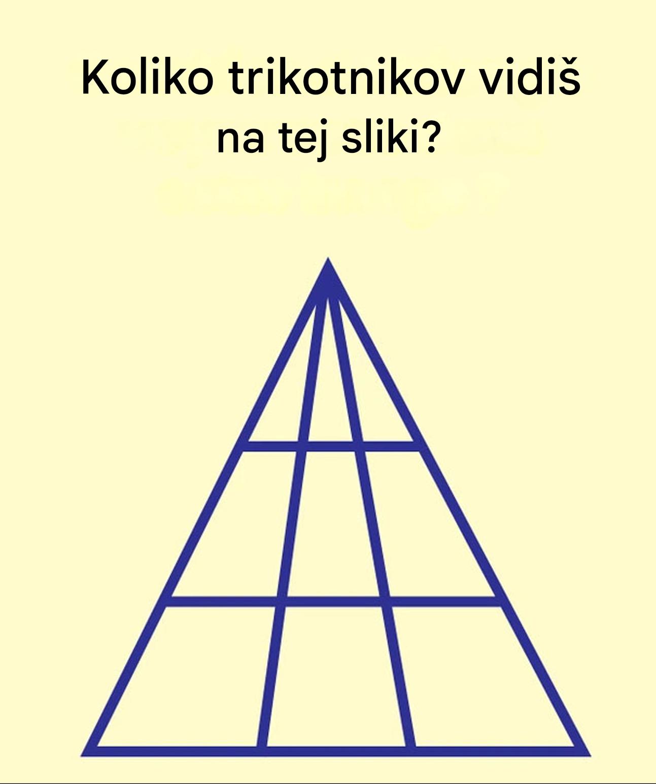 Znano vprašanje je varljivo preprosto: "Koliko trikotnikov je na tej sliki?" Pred vami leži velik trikotnik, razdeljen na več segmentov. Začnete jih mehanično šteti: 1, 2, 3, 4 ... in potem se zaplete. Vaše oči križajo in križajo črte, oblike se pojavljajo in izginjajo in hitro izgubite sled.