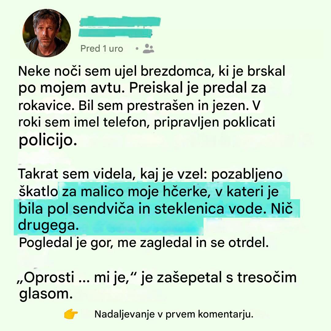 Ko ga je odprl, sem razumela. Pol sendviča in steklenica vode. Nič drugega. Takoj se je opravičil, glas mu je tresoč, prisegel je, da ne bi vzel ničesar več.