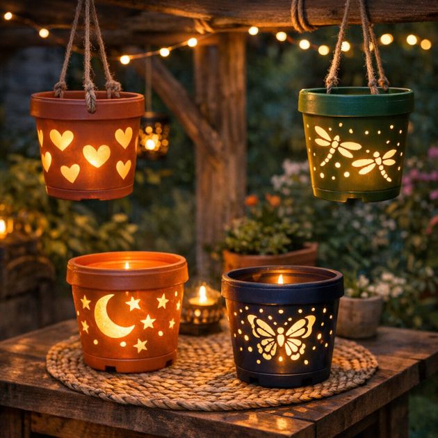 Ustvarite ambientalno osvetlitev na svojem vrtu ali terasi tako, da plastične cvetlične lončke spremenite v lampijone ali svečnike. Začnite tako, da z nožem izrežete okrasne vzorce ali oblike na straneh lončkov. Prepričajte se, da so vzorci dovolj veliki, da skoznje pronica svetloba.