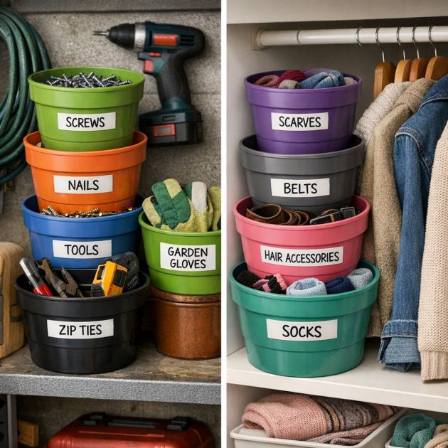 Plastični cvetlični lončki so odlični za organiziranje manjših predmetov v garaži, lopi ali omari. Uporabite jih za razvrščanje in shranjevanje orodja, žebljev, vijakov ali vrtnarskega materiala. Vsak lonček označite z njegovo vsebino z vodoodpornimi markerji ali nalepkami, da zagotovite, da bo vse organizirano in enostavno najti.
