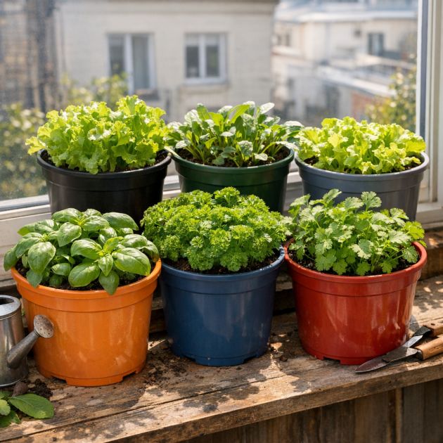 Posadite različna zelišča, kot so bazilika, peteršilj in koriander, ali listnato zelenjavo, kot sta solata in rukola. Lončke postavite na sončno okensko polico ali balkon, kjer bodo deležni vsaj šest ur sončne svetlobe na dan. Ta postavitev ne le prihrani denar pri nakupih živil, ampak vam zagotavlja tudi svežo, ekološko zelišče in zelenjavo na dosegu roke.