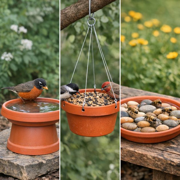Za izvedbo ptičje krmilnice izvrtajte majhne luknje blizu roba lončka in skoznje napeljite vrvico ali žico, da jo obesite. Lonček napolnite s ptičim semenom in ga obesite na vejo drevesa. Za postaje za napajanje čebele napolnite plitko posodo z vodo in dodajte kamenčke, na katere bodo čebele lahko varno pristale v kup.