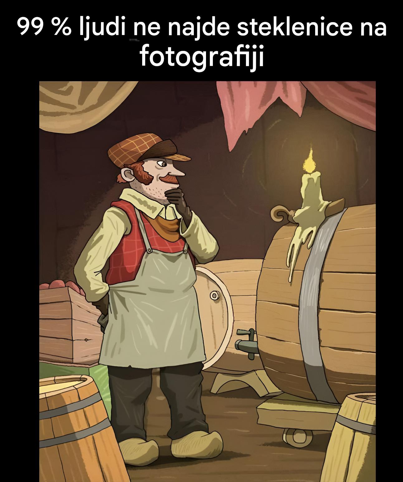 Vaš današnji cilj je preprost: natančno preučite to sliko in poiščite skrito steklenico. Ni potreben poseben talent, le malo potrpljenja ... in ostro oko. Prava vaja zaznavanja , ki bo preizkusila vaše sposobnosti.