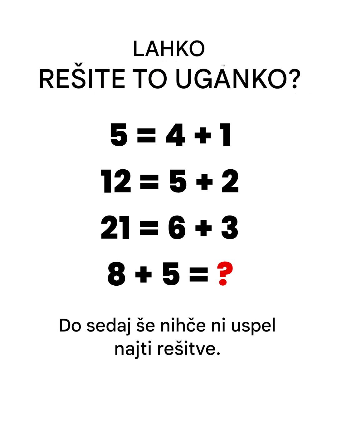 Prav ste prebrali. Preprosta majhna uganka, ki temelji na seštevanju, vzbuja radovednost na spletu. Zdi se otročja igra ... dokler je ne poskusite rešiti. Zakaj? Ker tukaj 1 + 4 dejansko pomeni 5, 2 + 5 pa je enako 12, 3 + 6 pa ... 21! Koliko je torej 5 + 8? Pripravite se, da boste matematiko videli v povsem novi luči!