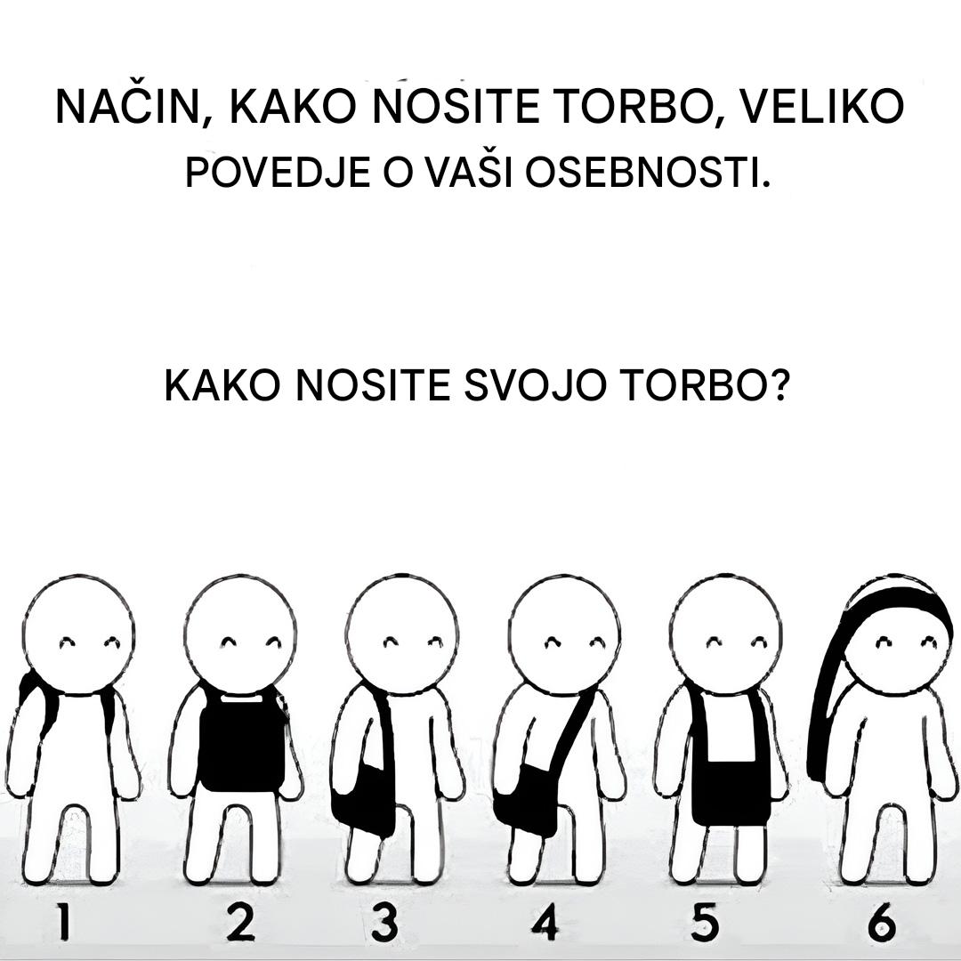 Vizualni testi se pogosto zanašajo na intuicijo, tisti majhen notranji glas, ki razkrije toliko o našem značaju, še preden naši možgani začnejo delovati. Naš spontani način, kako primemo torbo, jo namestimo ali nosimo, včasih razkrije več kot dolge razlage. Vsaka drža nezavedno odraža odnos do sveta: organiziranost, energijo, ustvarjalnost, previdnost, vodenje ... ali subtilno mešanico več lastnosti.