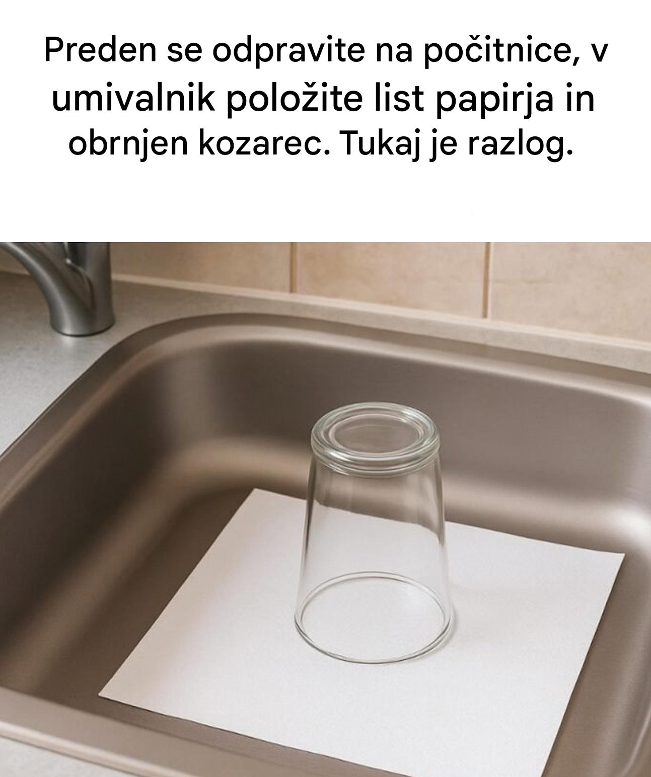 Pred odhodom pomislimo na vse: zapreti vodo, izprazniti hladilnik, nastaviti budilko. Kaj pa umivalnik? Pogosto nanj pozabimo. Pa vendar pogosto od tam prihajajo neprijetna presenečenja. Slabi vonji, vlaga, žuželke ... Na srečo obstaja zelo preprost trik, ki so ga odobrili strokovnjaki, je brezplačen in zelo učinkovit: obrnjen kozarec postavite na list vpojnega papirja v umivalniku. Majhna gesta, ki lahko naredi veliko razliko.